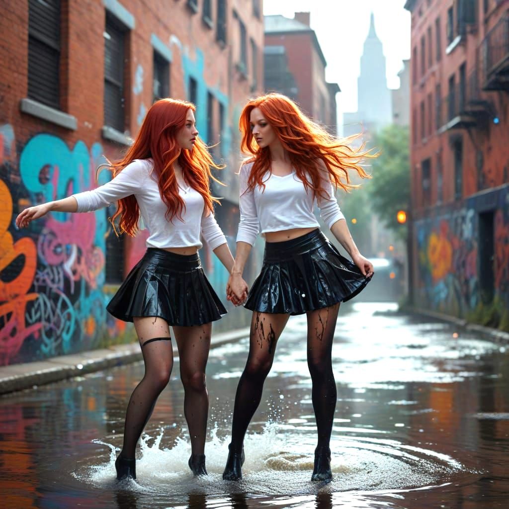 This image shows long-haired redheads dancing in splashing water amidst vibrant street art. The scene features a city backdrop with a cinematic depth of field, rendered in a highly detailed, colorful abstract style.