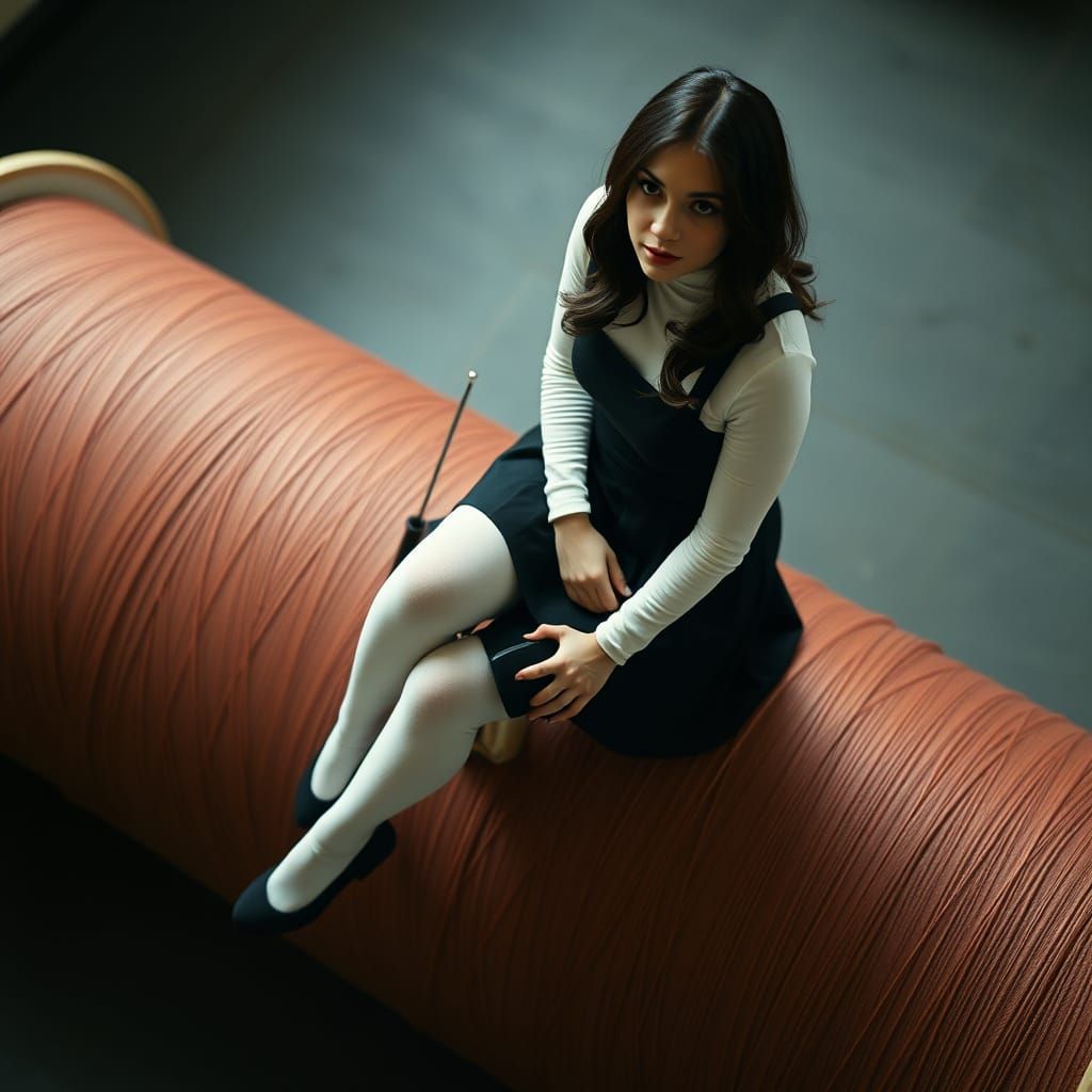 This image shows a young woman in a cinematic film still, sitting on the edge of a massive spool of thread with a colossal sewing needle beside her, emphasizing her tiny figure in a high-angle view.