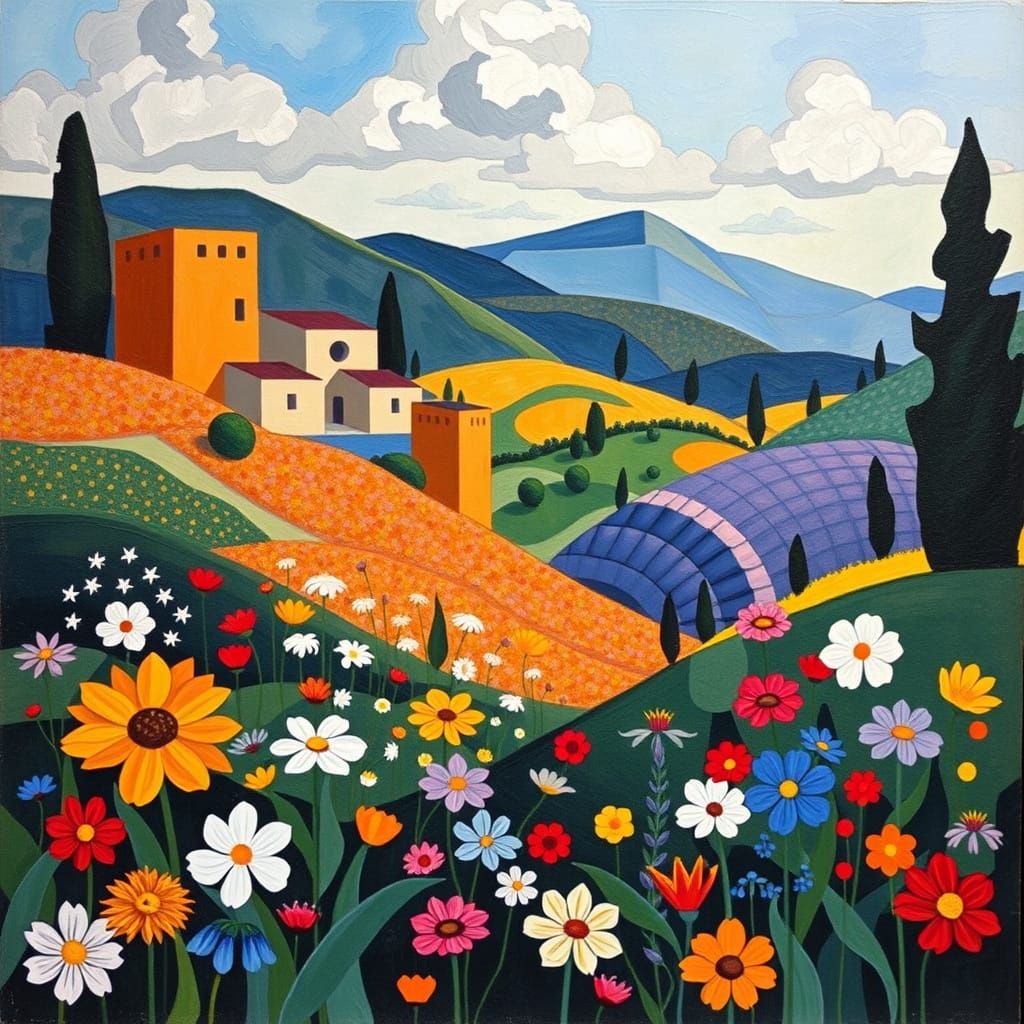 A vibrant, flower-filled landscape in an abstract cubist style. The image evokes a sense of geometric harmony and colorful abstraction.