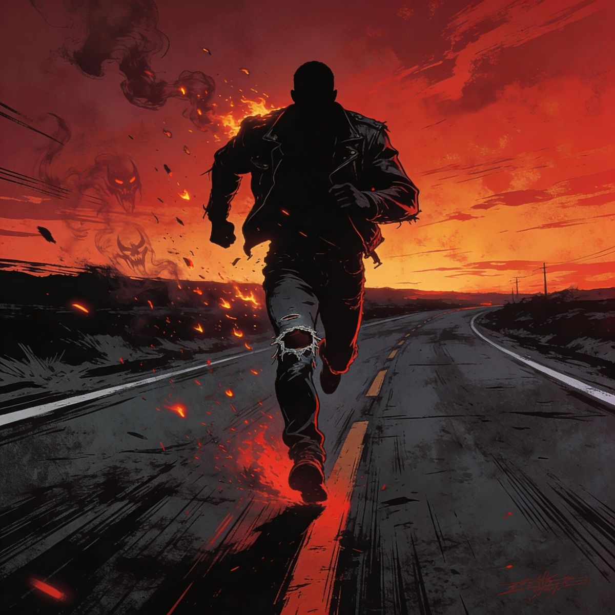 This image depicts a lone figure sprinting down a dark highway under a fiery red sky, rendered in a gritty, lowbrow art style reminiscent of classic rock posters.