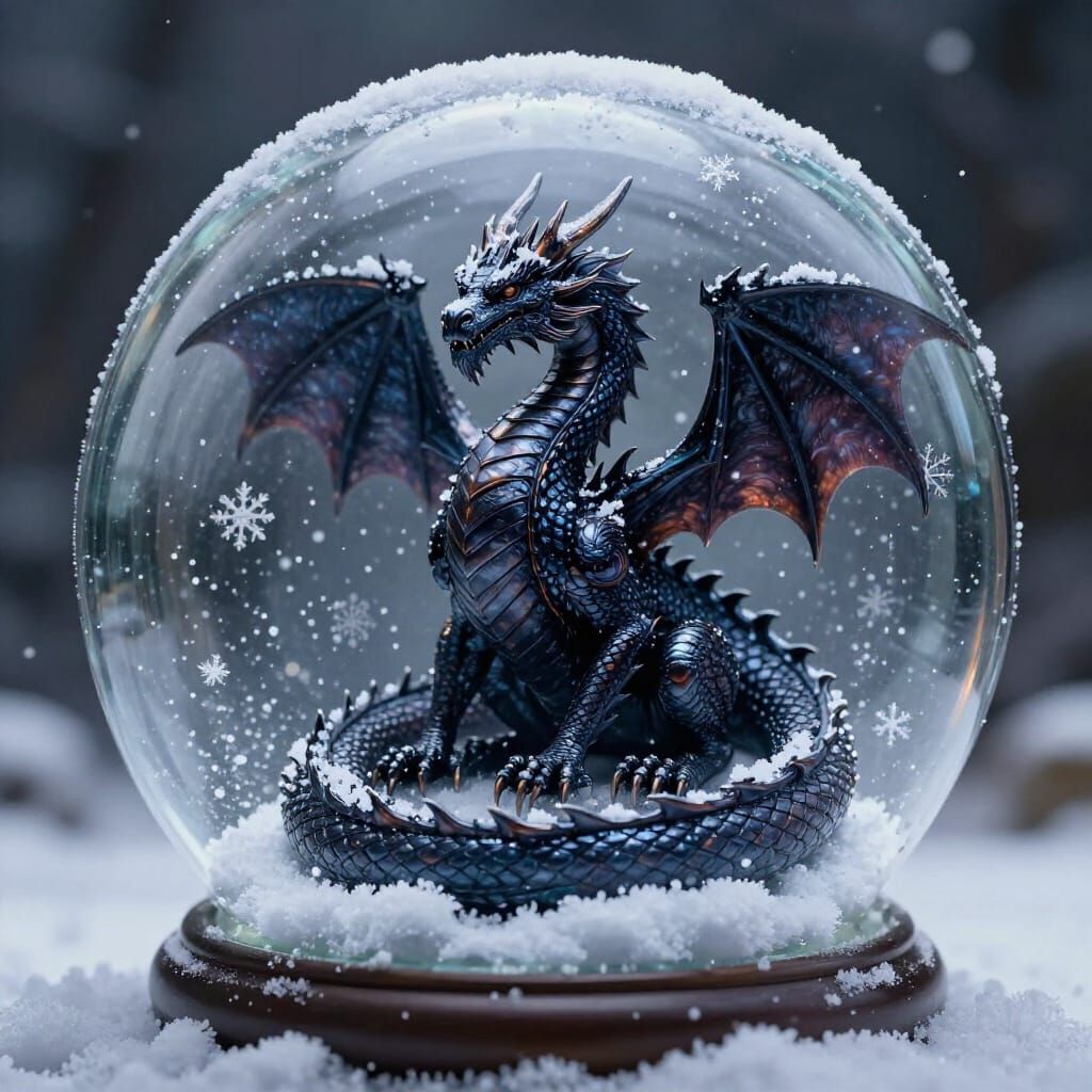 This image shows a hyperrealistic fantasy art depiction of an onyx dragon coiled inside a snow globe. Delicate snowflakes swirl around the creature, illuminated by dramatic, cool lighting.