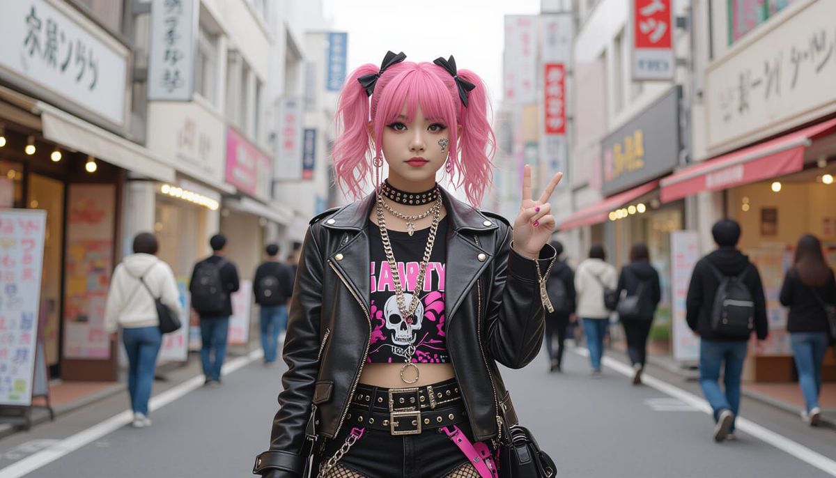 A vibrant portrait of a gyaru girl in punk fashion. The image captures the essence of Okinawa, Shibuya, and Harajuku styles.