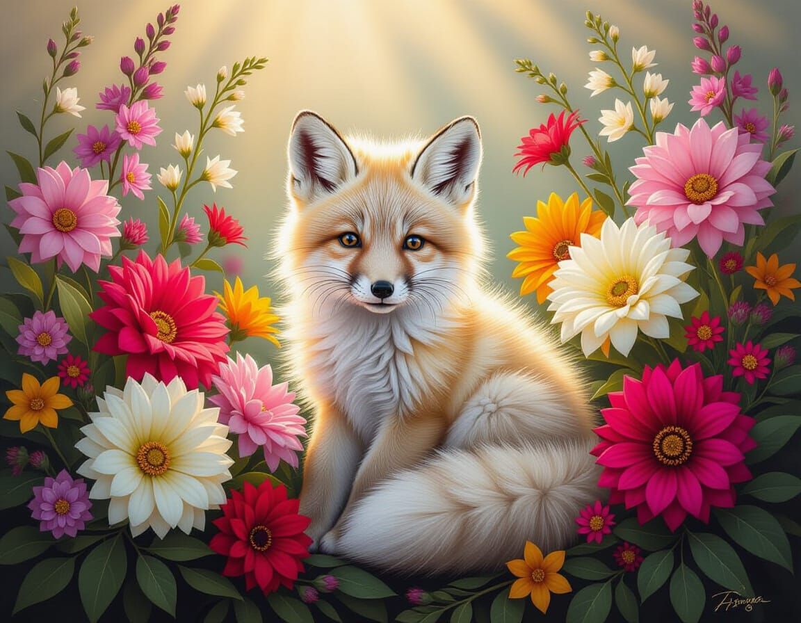 A hyperrealistic still life of an arctic fox pup among exotic flowers. The image has a soft, diffused light and meticulous detail, similar to Dutch Masters.