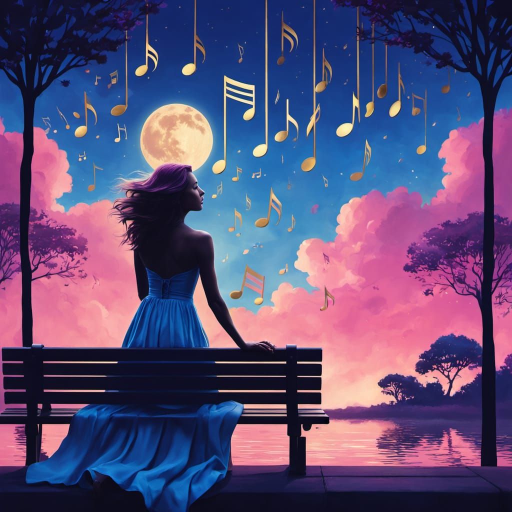 This digital matte painting captures a woman's hopeful gaze against a twilight sky. Glistening golden musical notes float upwards, creating an ethereal and romantic atmosphere.