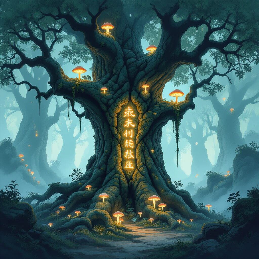 This image depicts a mystical primeval forest with an ancient, gnarled tree marked by glowing runes. Luminescent fungi light the scene, rendered in the atmospheric style of traditional ink wash painting.
