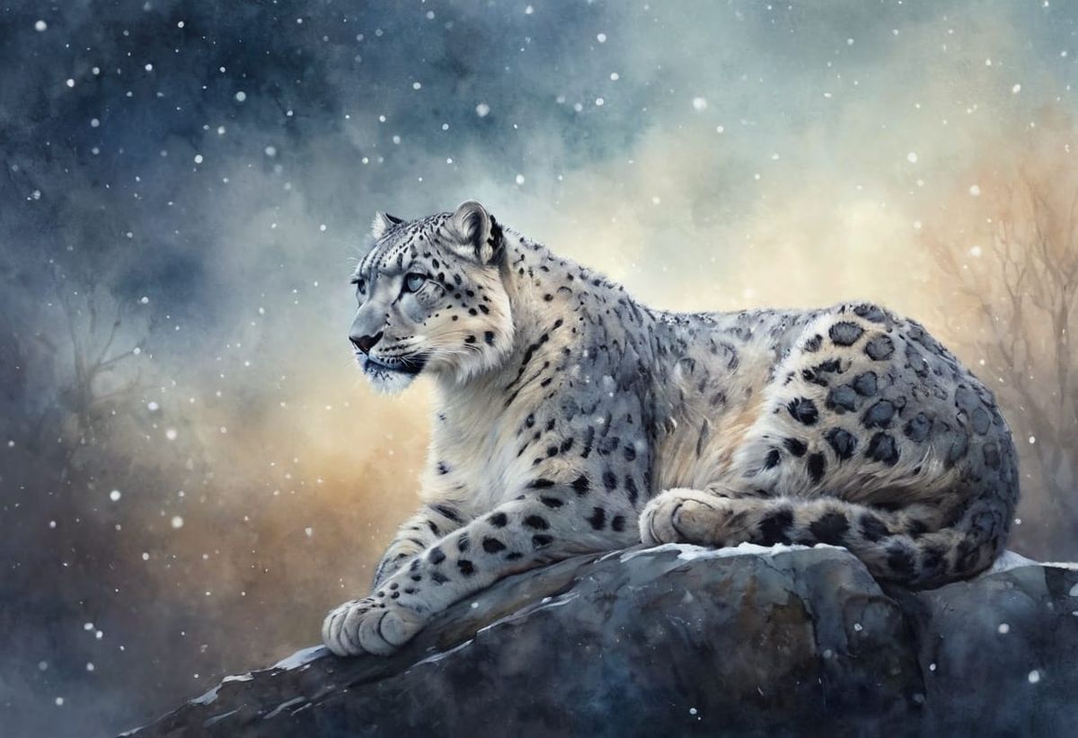 This image shows a snow leopard in soft moonlight, with gentle snow falling. Rendered in a dreamy, ethereal watercolour style with cool tones and delicate textures.