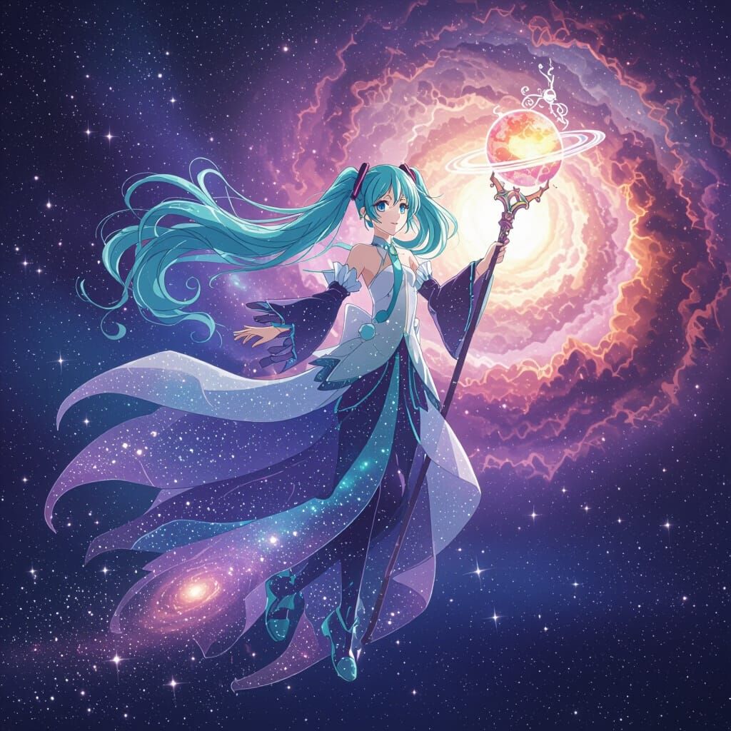Create your own Hatsune Miku-inspired cosmic art with our free AI image generator. It's easy and fun!