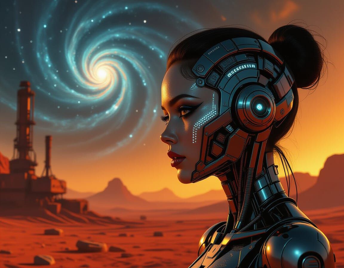 This image depicts a close-up of a high-fashion woman with glowing skin and cybernetic implants on a dusty, alien world. Features dramatic lighting and deep colors in a realistic fantasy matte painting style.