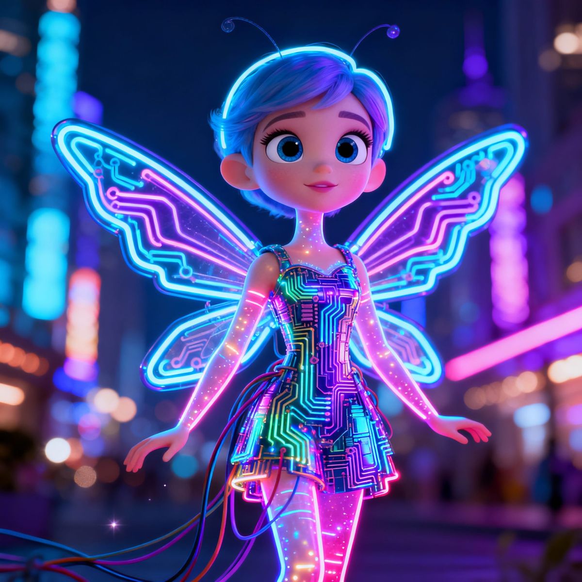 A 3D cartoon illustration of a fairy with large eyes, wearing clothes made of circuit boards. Her skin glows with neon light against a vibrant, blurred city background.
