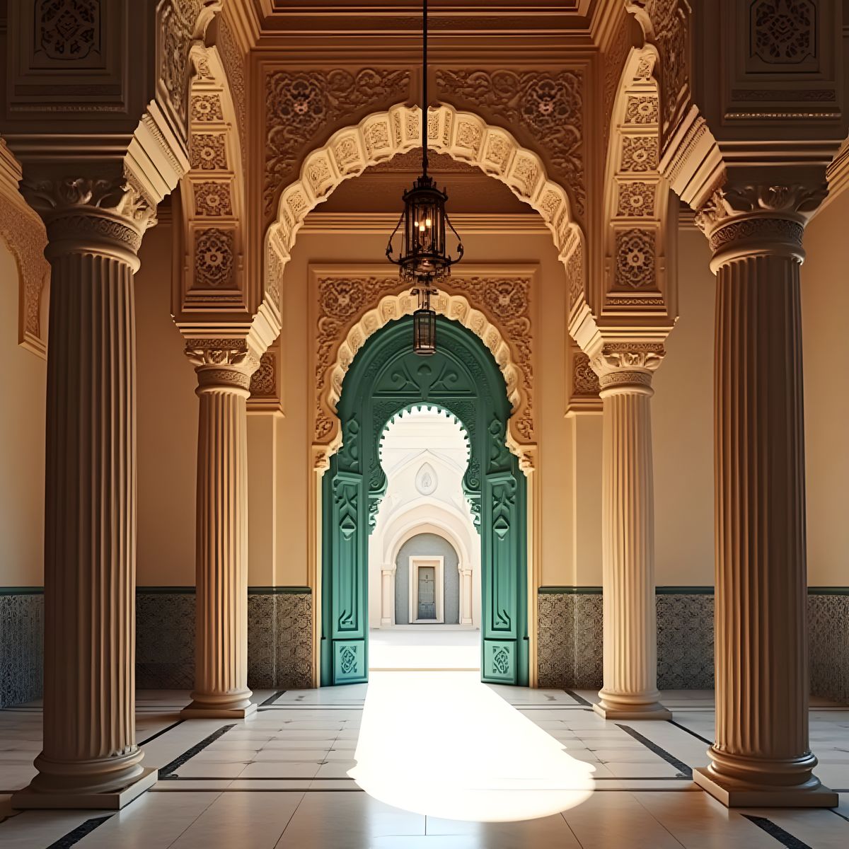 A meticulously detailed view of a grand Moroccan interior, featuring a teal arched doorway framed by carved columns. Natural light highlights intricate geometric and floral designs, creating a symmetrical and magnificent scene.