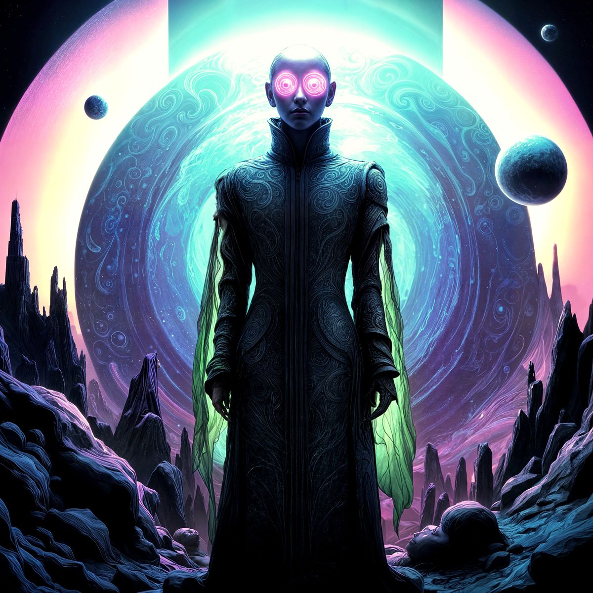 This hyperrealistic 3D image is a breathtaking, cinematic representation of a dark, shadowy figure in a psychedelic blacklight poster. Featuring glowing purple and green accents, deep blue shadows, and ultrafine detail, this image is a masterpiece of magical realism.