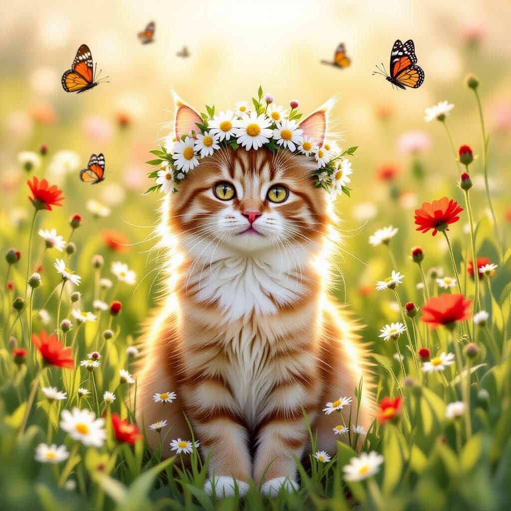 A watercolor painting of a ginger cat wearing a flower crown in a sunlit meadow. Butterflies and bees flutter around the cat in this soft, dreamy illustration.