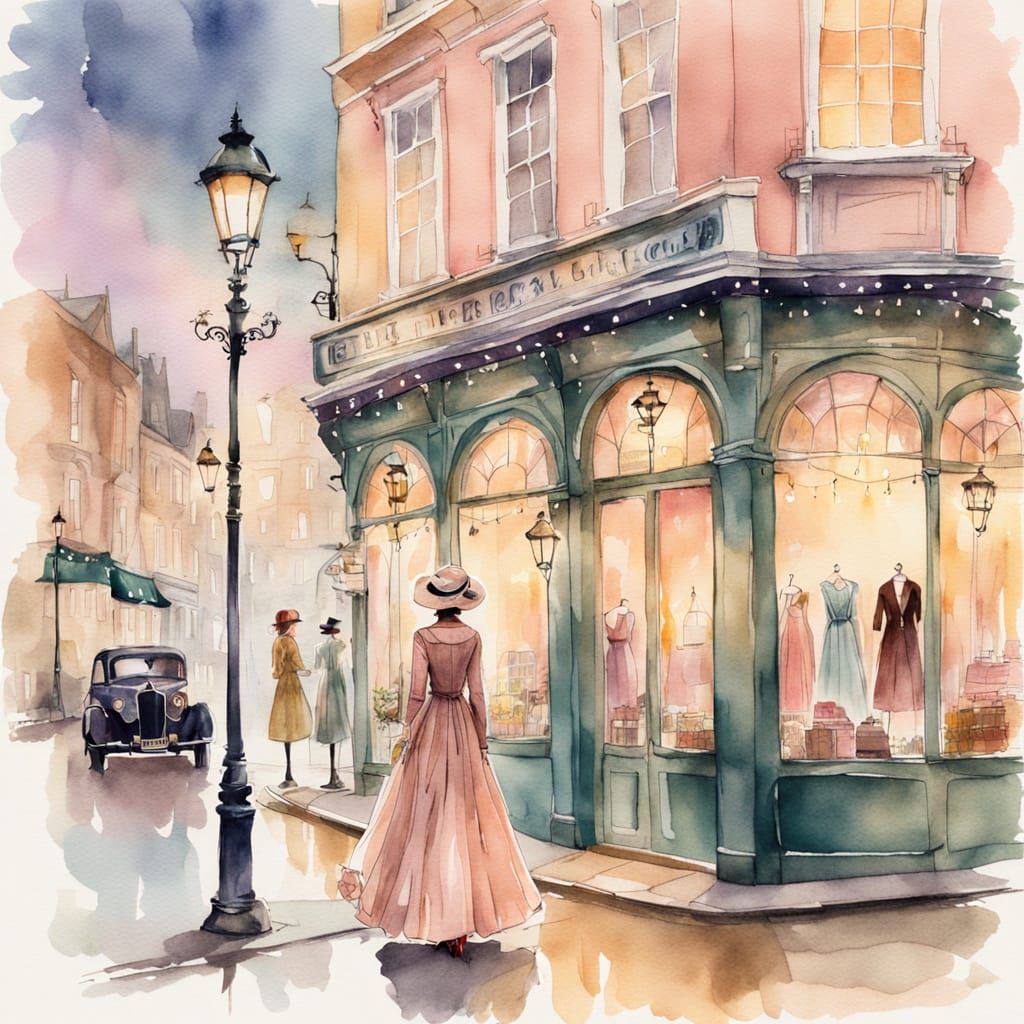 This charming watercolor illustration captures a woman in a beautiful vintage dress standing next to a quaint clothing shop on a classic London street. Soft focus and delicate textures evoke a dreamy, romantic atmosphere with Victorian street lamps and a vintage car adding to the nostalgic charm.