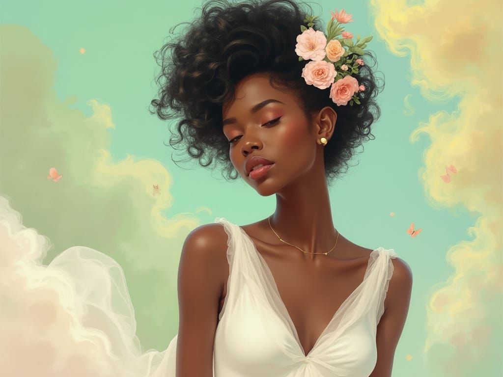 This image shows a serene black woman with pastel flowers in her hair, wearing a flowing white gown. Dreamlike pastel swirls create a whimsical, painterly, impressionistic atmosphere.