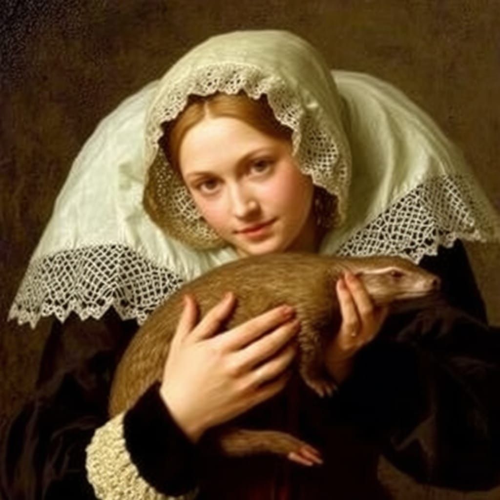 This image shows a woman in Tudor dress holding a mongoose. The AI has produced a striking and unusual image.
