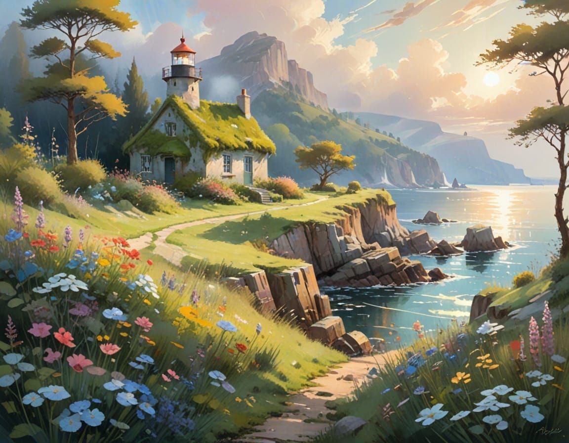 A scenic view of a lighthouse and cottage nestled in a wildflower meadow. This artwork evokes a serene atmosphere through soft lighting and impressionistic watercolor techniques.