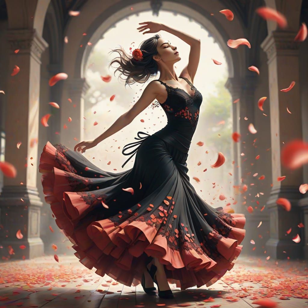 A striking picture of a flamenco dancer in motion. The image captures the passion and energy of the dance, with swirling floral accents in an anime style.