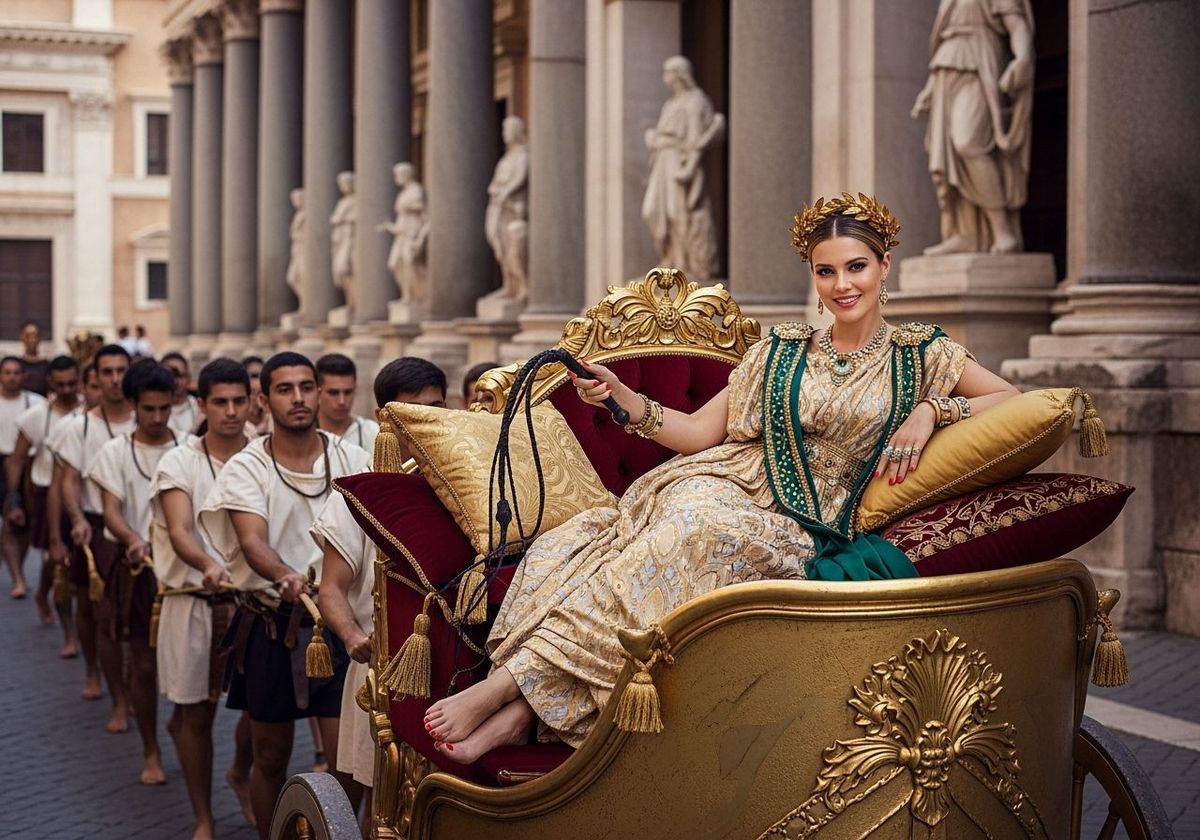 This image shows a Roman Empress regally reclining in her golden chariot as it's pulled through ancient Rome. The photograph captures the opulence of the scene with natural lighting and a soft bokeh.