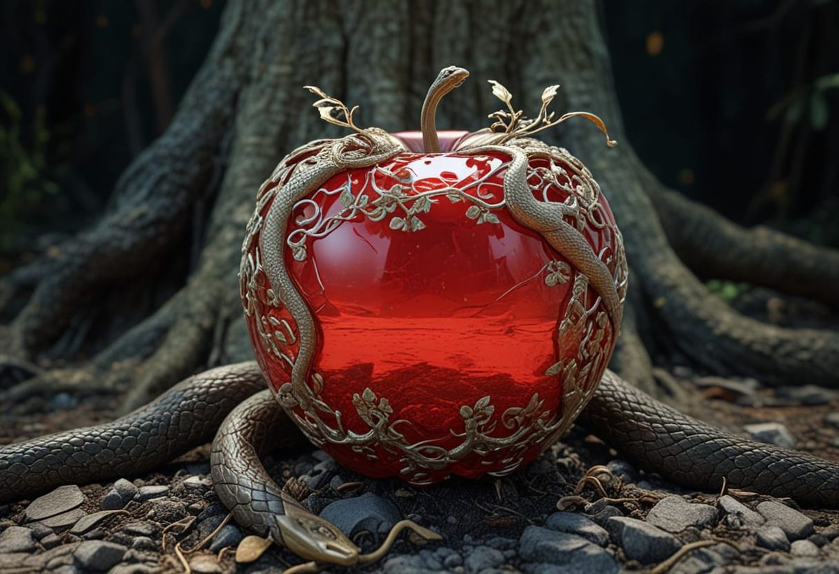 A stunning, intricately detailed glass apple with a snake inside, adorned with beautiful gold filigree, sits amidst tree roots, showcasing fantastical, high-fantasy concept art with deep colors and intricate design.