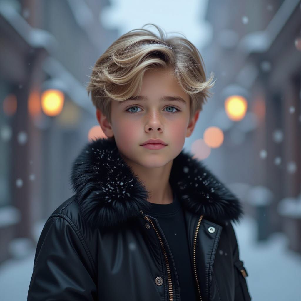 A portrait of a blonde teenage boy in a black bomber jacket with a fur collar. The image features dynamic and volumetric lighting, intricate textures, and a splash art aesthetic in triadic colors.