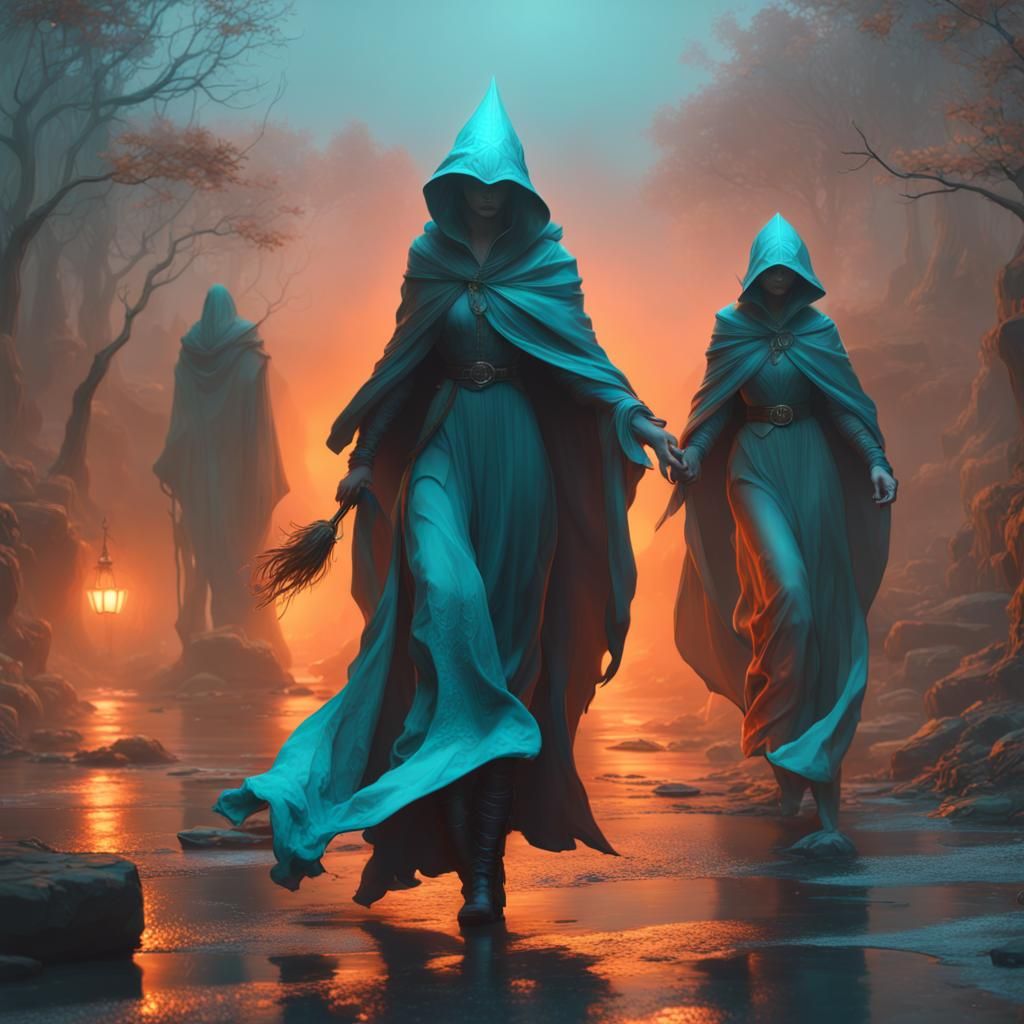 A vivid image of witches shrouded in mist wearing capes and hoods. The artwork features dynamic lighting and intricate detail with orange and teal accents in a splash art style.