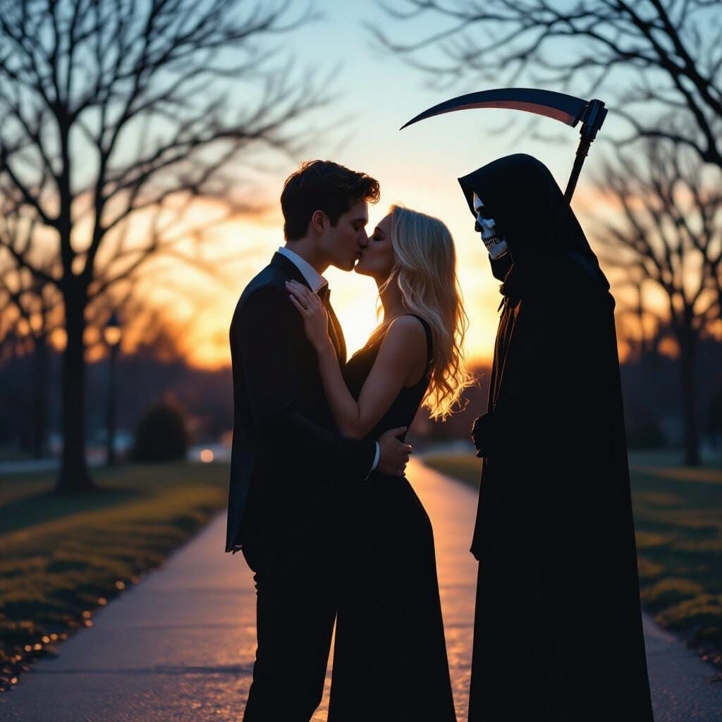 This cinematic image depicts a couple kissing at dusk, with their shadows visible. His shadow transforms into a grim reaper, suggesting a dark romance with dramatic, contrasting colors.