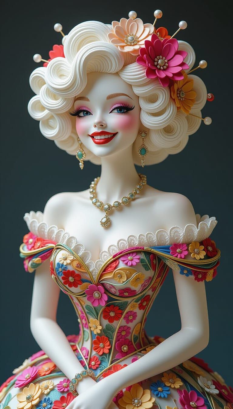This image depicts a curly-haired albino woman in an elaborate gown, expressing frustration with elegance. The artwork features hyperdetailed elements and resin wire art, set against Escher-style architecture.