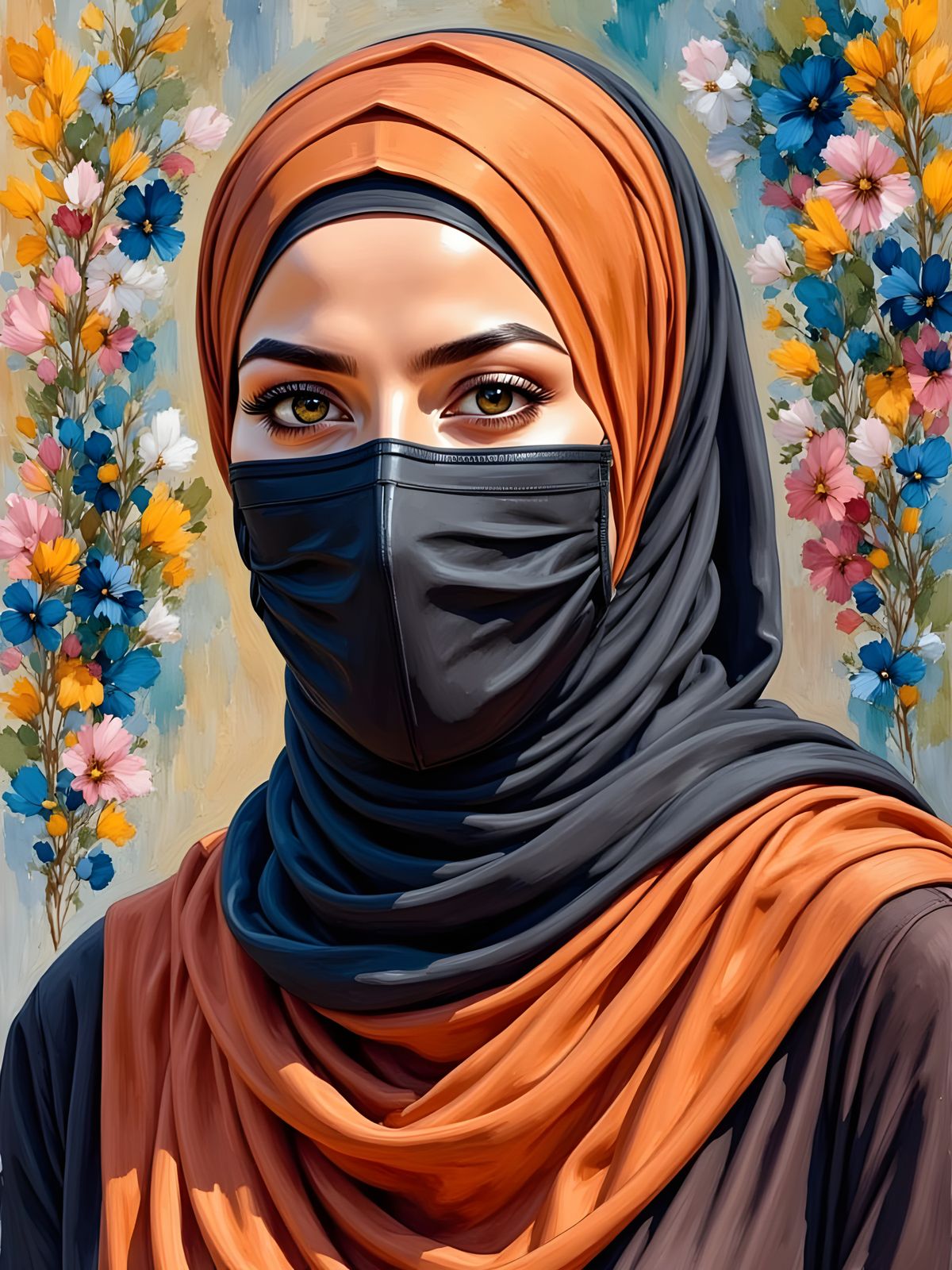 A portrait of a young woman wearing a hijab and face mask. The image is a detailed painting with deep colors and modest earth tones, emphasizing fabric textures.