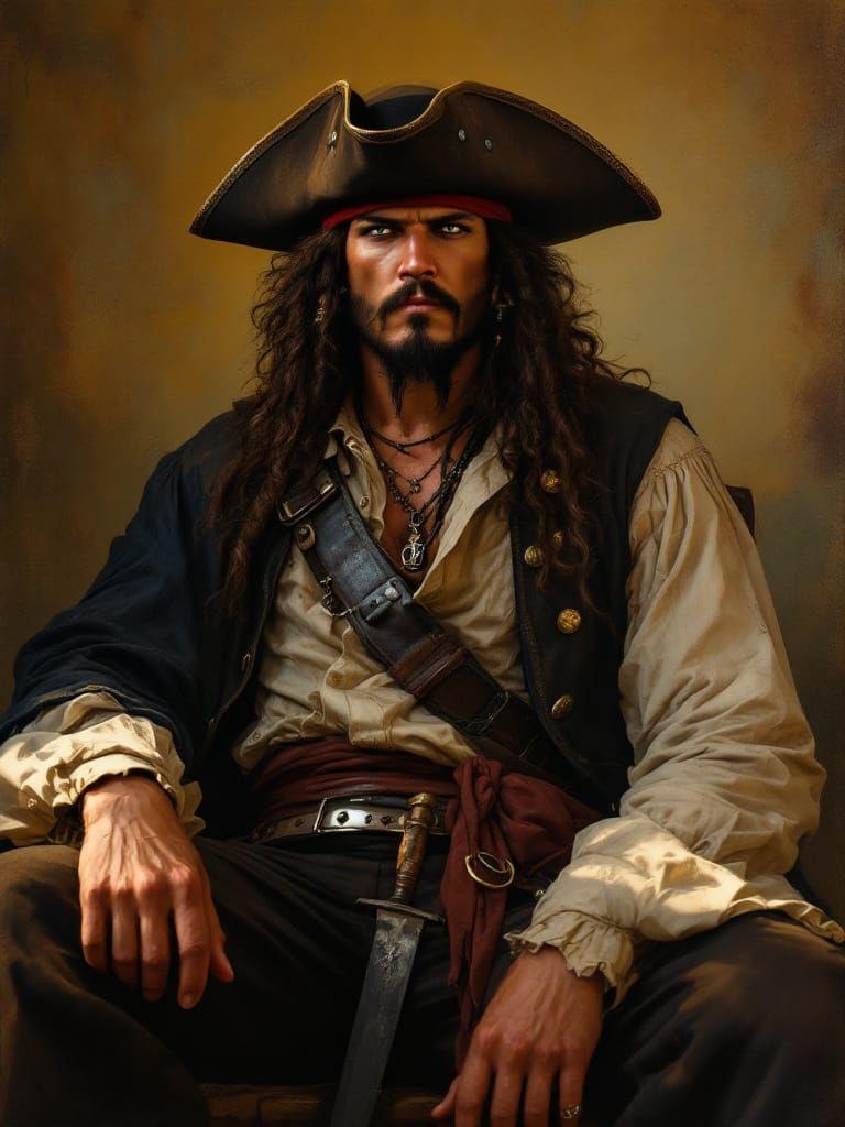 This image depicts Blackbeard in a dramatic, chiaroscuro-lit portrait, blending spaghetti western tension with vintage pin-up polish for a striking visual.