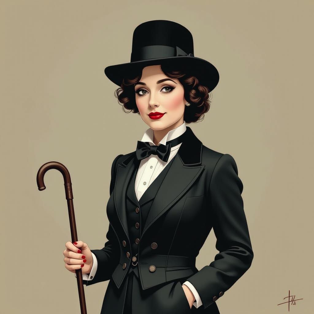 This image shows a woman in a Charlie Chaplin costume, complete with fedora, bow tie, and cane. The monochromatic background evokes the feel of 1920s silent films with vintage flair.