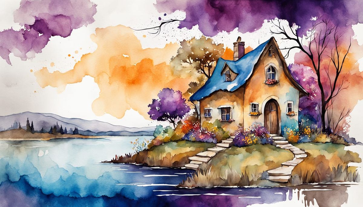 This image showcases a fairytale cottage beside a lake, rendered in vibrant cerulean and purple hues. It features a watercolor and ink splash art style with a modern, realistic European aesthetic and a distressed texture.