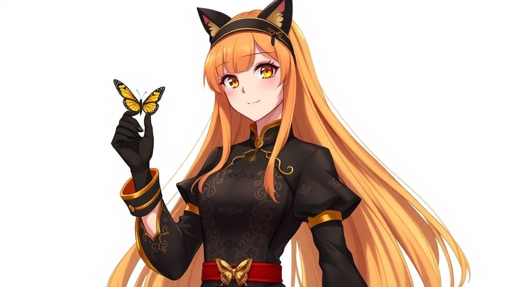 A semi-realistic manga-style illustration of a young woman with a confident smile, holding a small yellow butterfly, and wearing a striking black cheongsam dress with golden accents and cat ear headband.