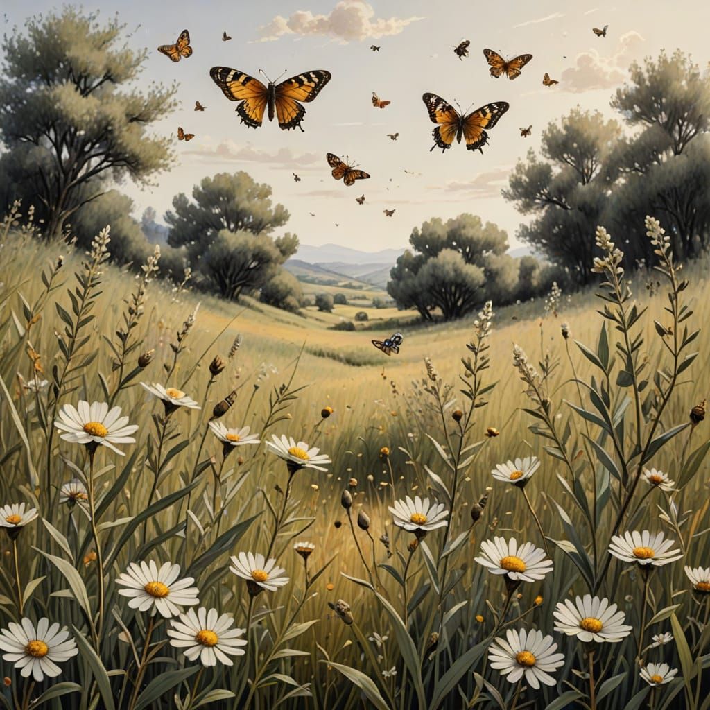 This image is a detailed pencil and ink illustration of an olive field with wildflowers, butterflies, and bees, set against a soft white background, featuring intricate details and textured shading.