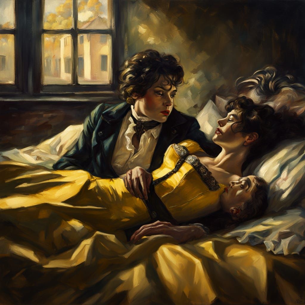 This image shows a brunette woman in a yellow leather corset and hot pants lying on a bed. The image evokes an oil painting with soft, golden lighting and dark shadows, creating a moody, nostalgic atmosphere.