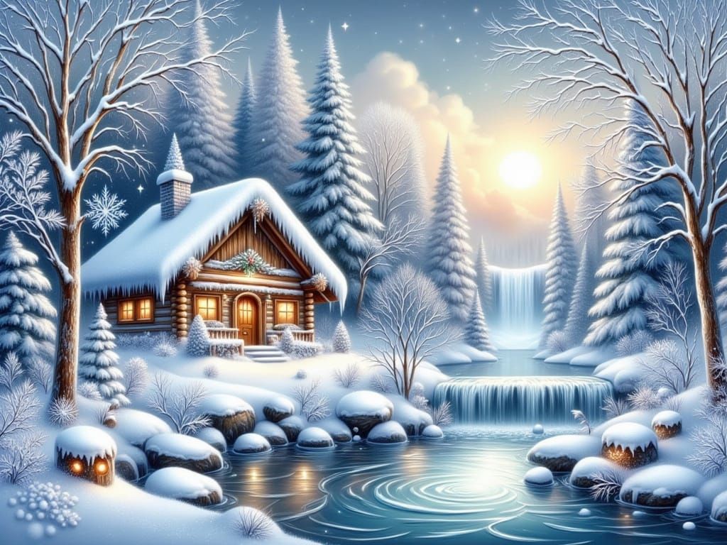 This image captures a serene winter scene of a rustic log cabin nestled in a forest, surrounded by a snow-heavy landscape, with a river and waterfall, and giant snowflakes gently falling, rendered in a Carne Griffiths-inspired watercolor style with intricate details and shimmering sparkles.