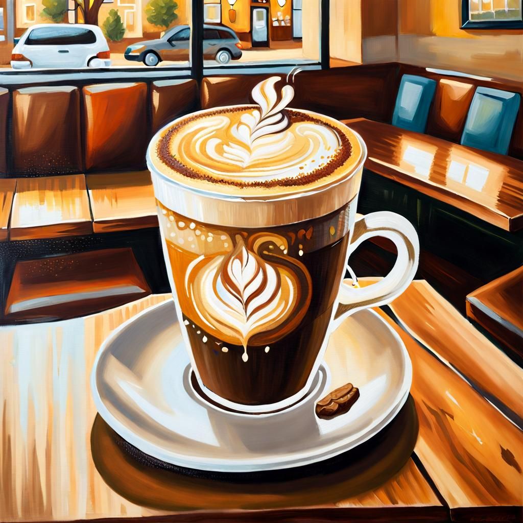 A striking picture of a latte in a cozy coffee shop bathed in natural light. The composition and colors evoke a blend of Baroque and Impressionist styles.