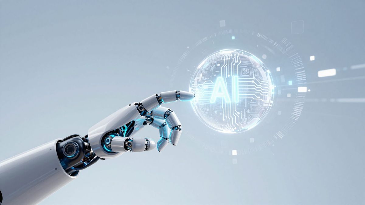 This high-key corporate graphic showcases a sleek, white futuristic robotic hand with glowing cyan joints. It reaches towards an abstract sphere representing AI and data flow, set against a minimalist blue gradient background with digital pixels.