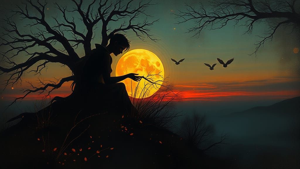 This image shows a surreal autumn scene with a thick oil patina effect. It has a glitchcore aesthetic with glowing elements, rendered with a golden ratio composition.