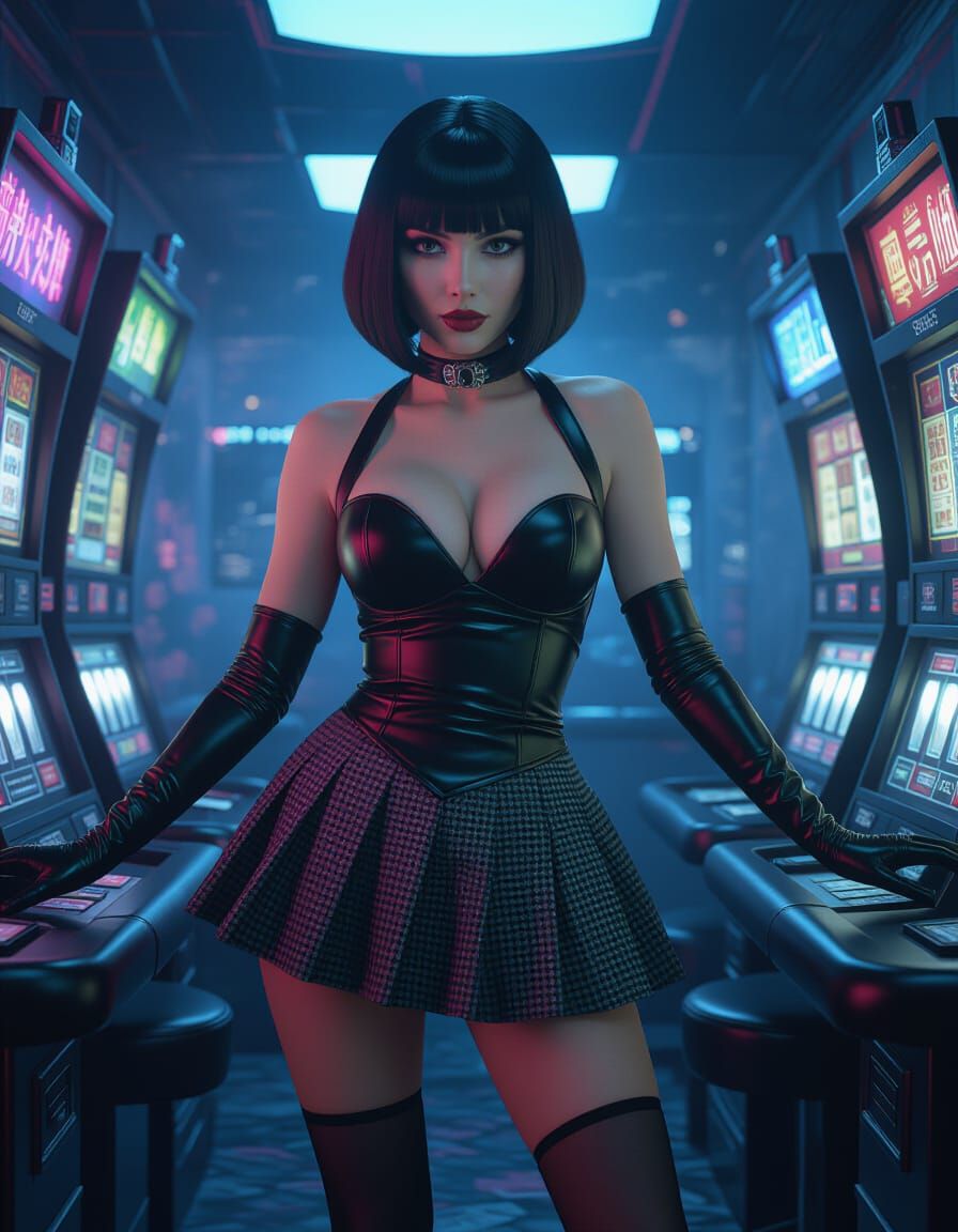 A striking close-up of a cosplayer in a cyberpunk casino. This image showcases a hyperrealistic anime-style woman in a dynamic pose, rendered with cinematic flair and intricate details.