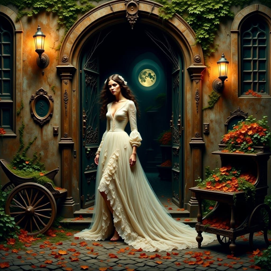 A captivating image of a woman in vintage attire amidst a dilapidated Victorian city. The scene features gothic architecture, soft moonlight, and symbolic details, rendered with the depth of old master's painting techniques.
