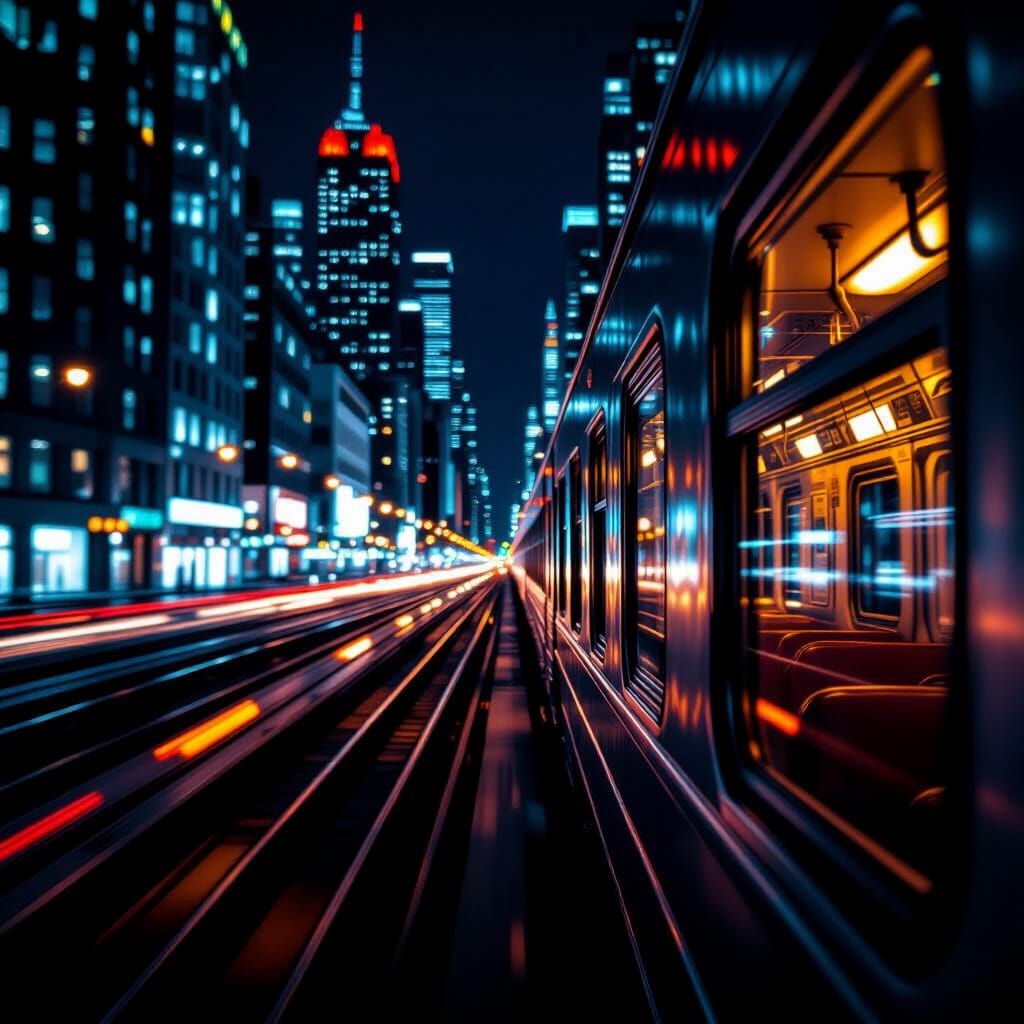 A hyperrealistic photo captures a scenic view of New York City at night from a train window. Bokeh lights streak past, with reflections on the glass.