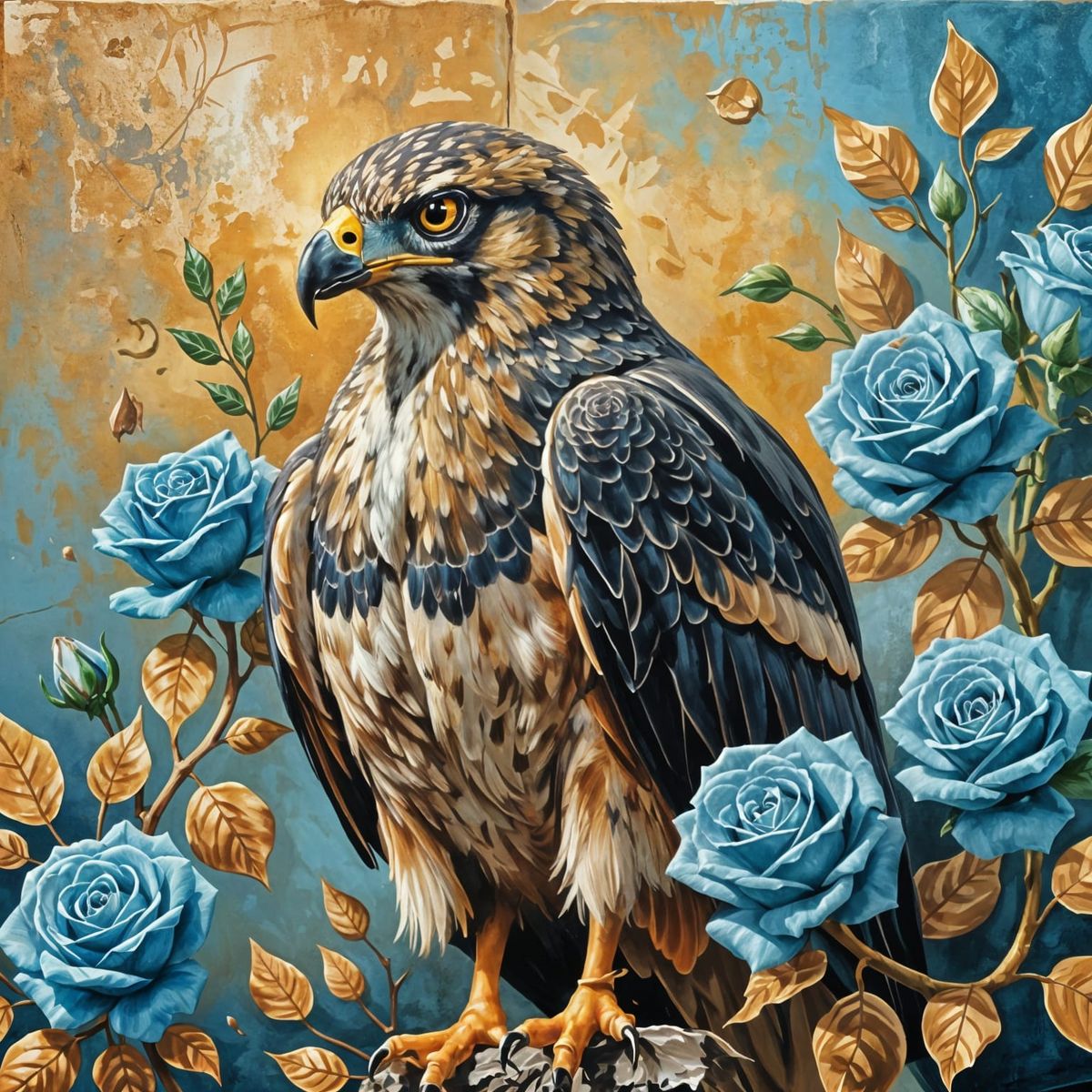 A striking picture of a hawk perched among blue roses. The image is rendered with a textured, impasto painting style, resembling old paint on stucco.
