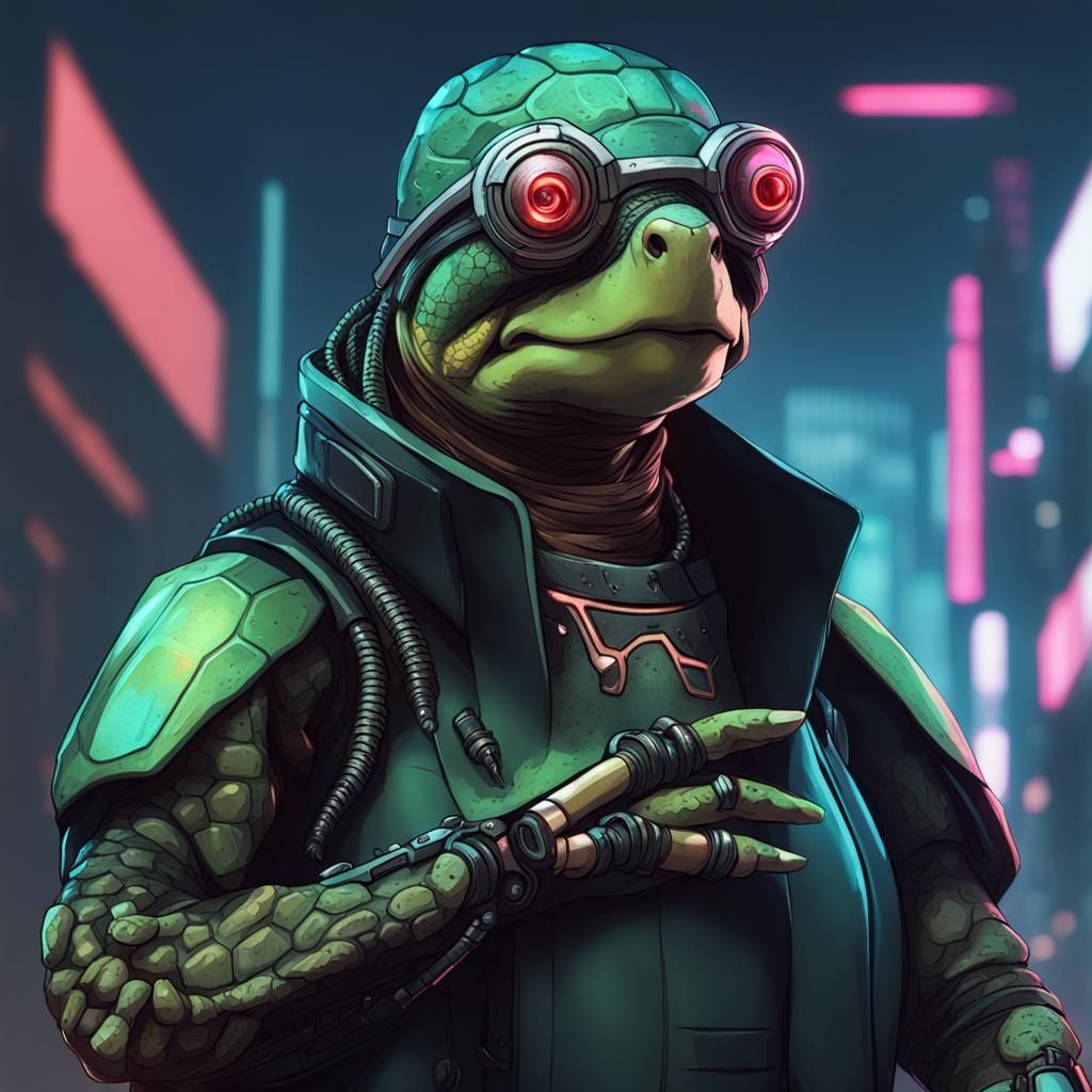 A cyberpunk style image of an anthropomorphic turtle. The artwork features a futuristic aesthetic and portrays the turtle-person in a gritty, urban environment.