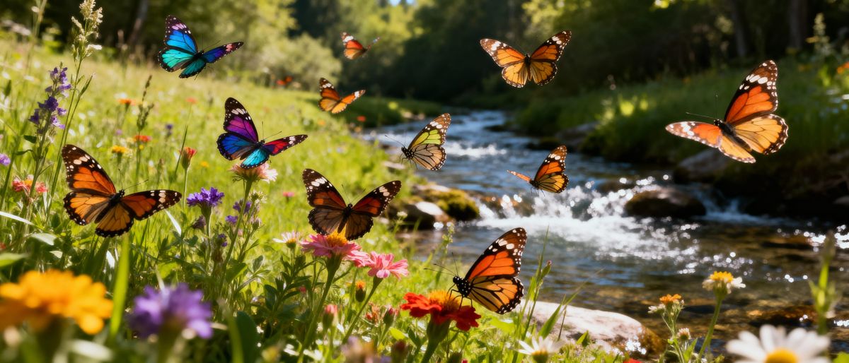 Easily generate your own stunning images of butterflies and wildflowers by a babbling brook with our free AI tool.