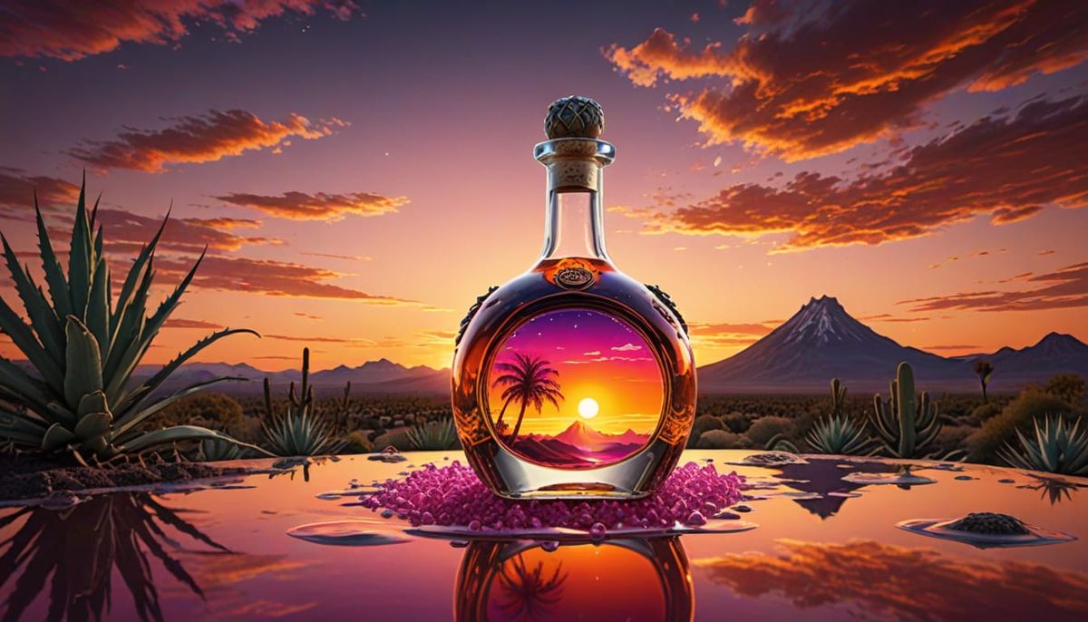 A surreal scene depicts a glowing sun melting into a swirling sunset. A giant tequila bottle pours light as agave plants grow from floating islands in this dreamlike digital artwork.