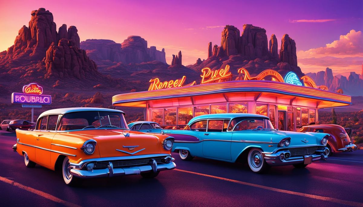This image depicts vintage cars traveling along a desert highway. The scene includes colorful roadside attractions, vibrant neon signs, and detailed diner elements bathed in a warm sunset light, rendered as detailed digital art.