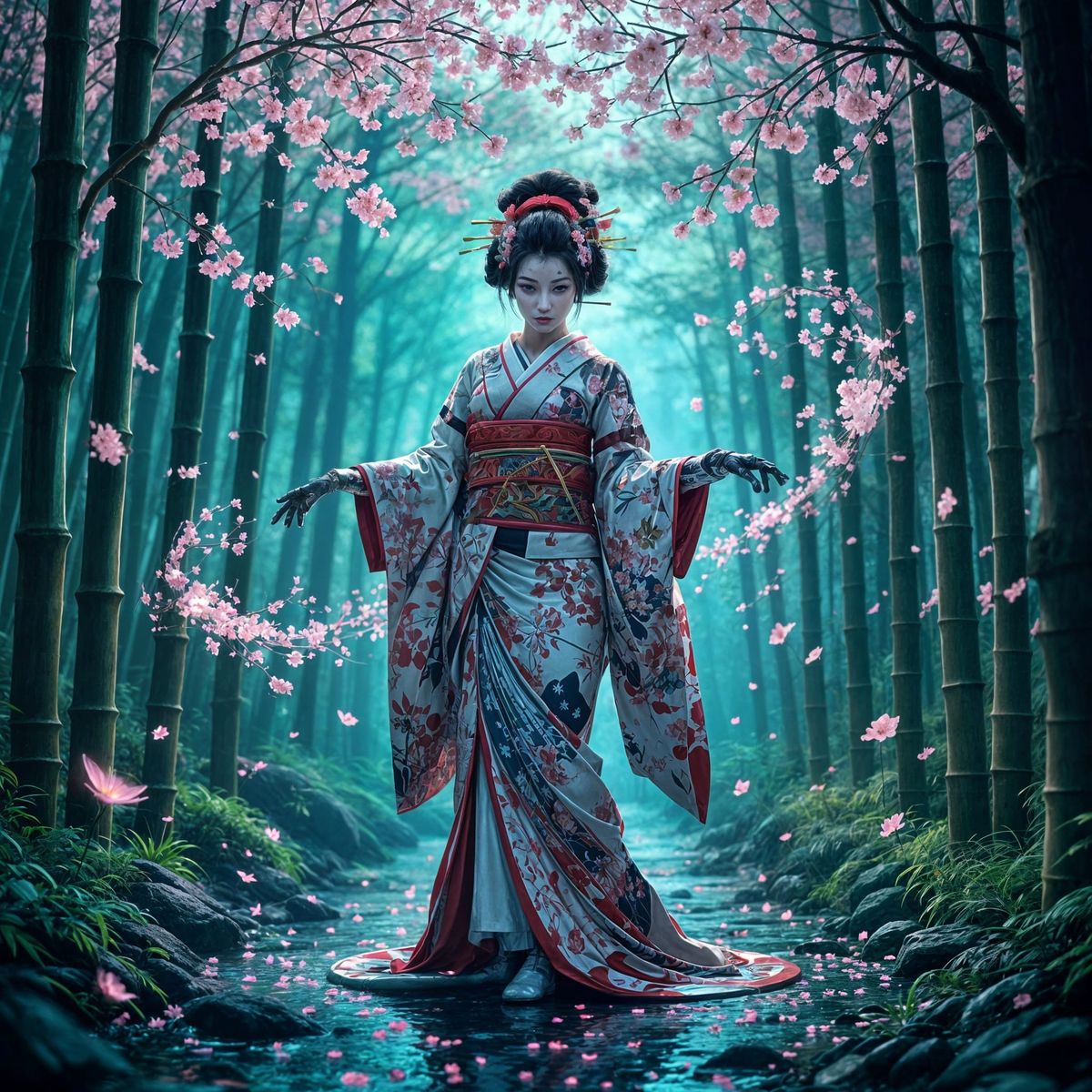 This image shows a cyborg geisha dancing in a neon-lit bamboo forest in futuristic Kyoto. Holographic cherry blossoms swirl in the air in a digital matte painting style.