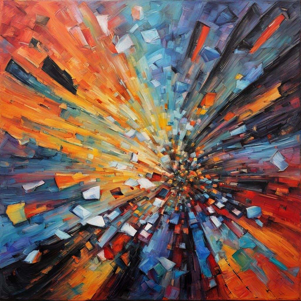 This vibrant oil painting depicts a guitar's persona as a swirling vortex of colors, evoking the essence of rainbows and music. Thick layers of textured paint create a dynamic, neo-impressionist style that captures the emotional intensity of sound and color.