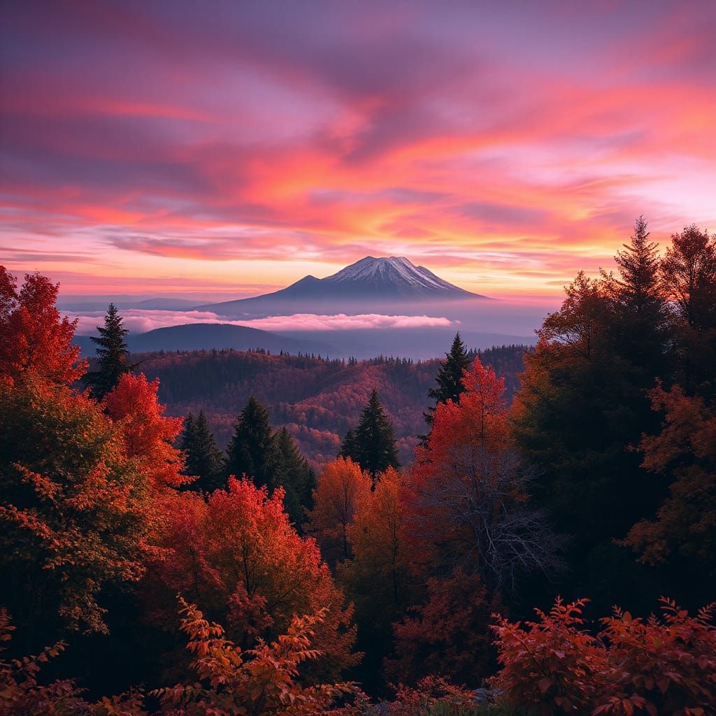 This image shows a majestic forest landscape with vibrant orange leaves and rich autumn colors, set under a breathtaking purple sunset sky with a distant misty purple mountain, evoking a sense of hyper-realistic wonder.