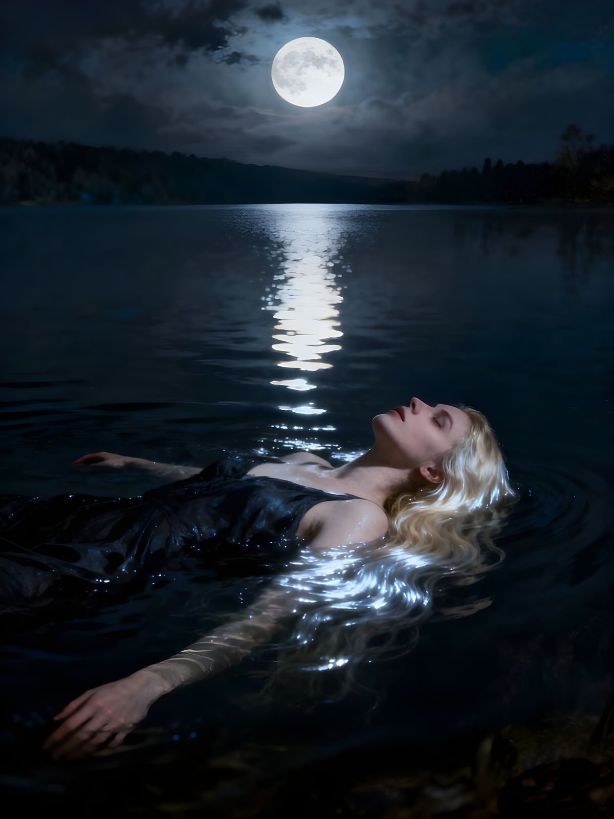 This image shows a woman with blonde hair floating face down in a dark lake, illuminated by moonlight. The aerial perspective contrasts her glowing form against the dark water and landscape.